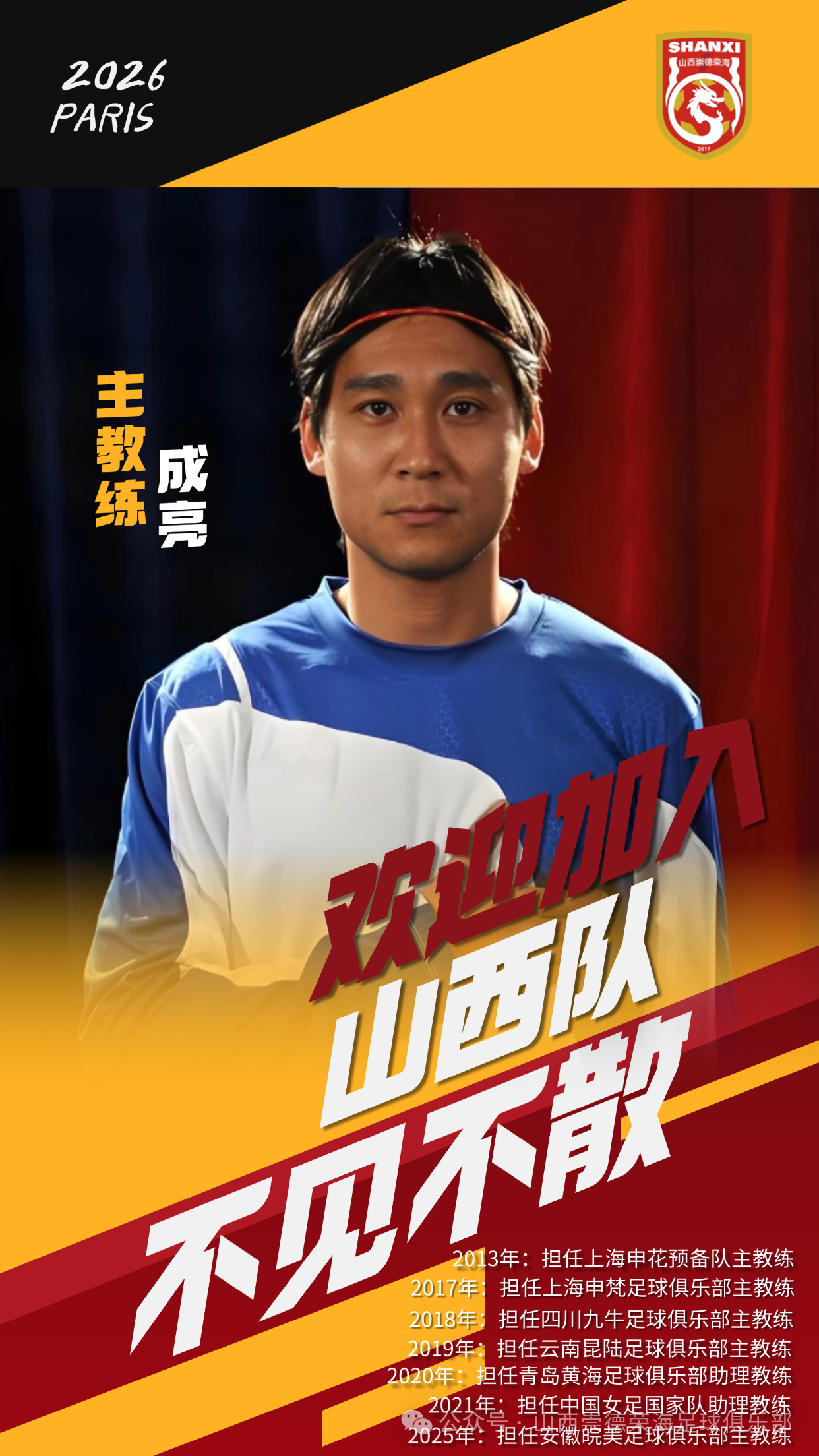 而当年作为球员的成亮,则在2012年退役之后,就转型成为了教练。本赛季更是北上,拾起了山西崇德荣海的教鞭,开启了崭新的绿茵征程。